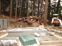 積まれた建材から推すに、木造鉄板葺の鞘堂のなかに、本殿が据えられてたらしいな」
